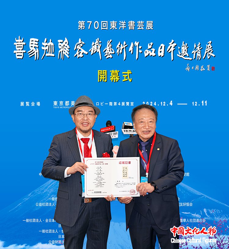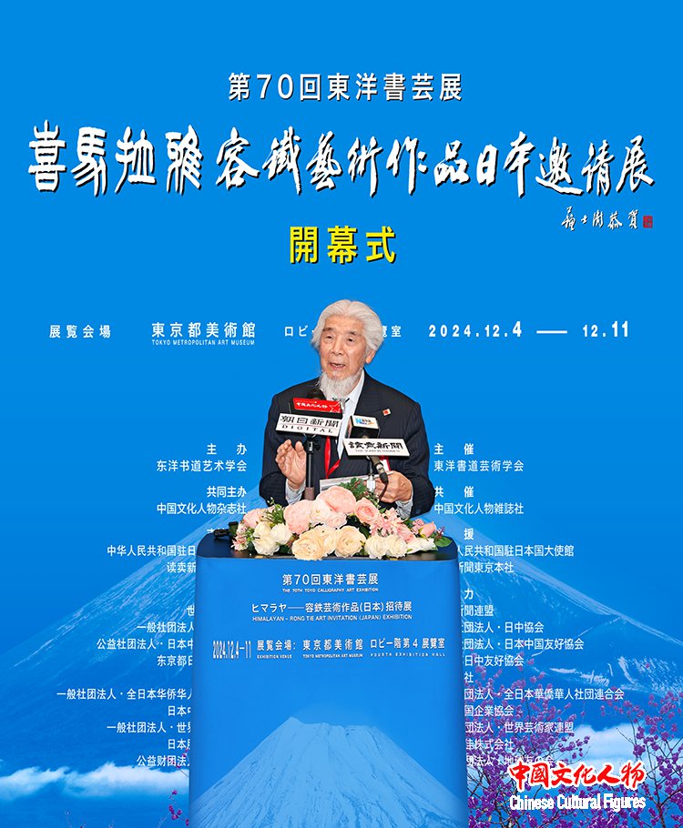 由东洋书道艺术学会主办,中国文化人物杂志社共同主办,中国驻日本国大使馆、读卖新闻东京总社支持,世界新闻联盟、一般社团法人日中协会、公益社团法人日中友好协会、东京都日中友好协会、西泠印社、一般社团法人全日本华侨华人社团联合会、日本中国企业协会、一般社团法人世界艺术家联盟、日本胜佳株式会社、公益财团法人地球之友等单位协办的“第70届东洋书艺展——喜马拉雅——容铁艺术作品(日本)邀请展”开幕式于12月7日在日本东京都美术馆隆重举行