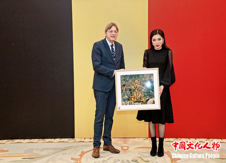 2023年,比利时第二任首相居伊·伏思达收藏米巧铭作品并合影留念