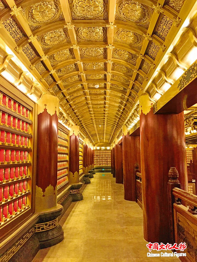 大佛寺内部铜装饰均为金星铜工程筑造,廊上吊顶采用独特工艺,图案精细雅致,色彩艳丽却又端庄肃穆