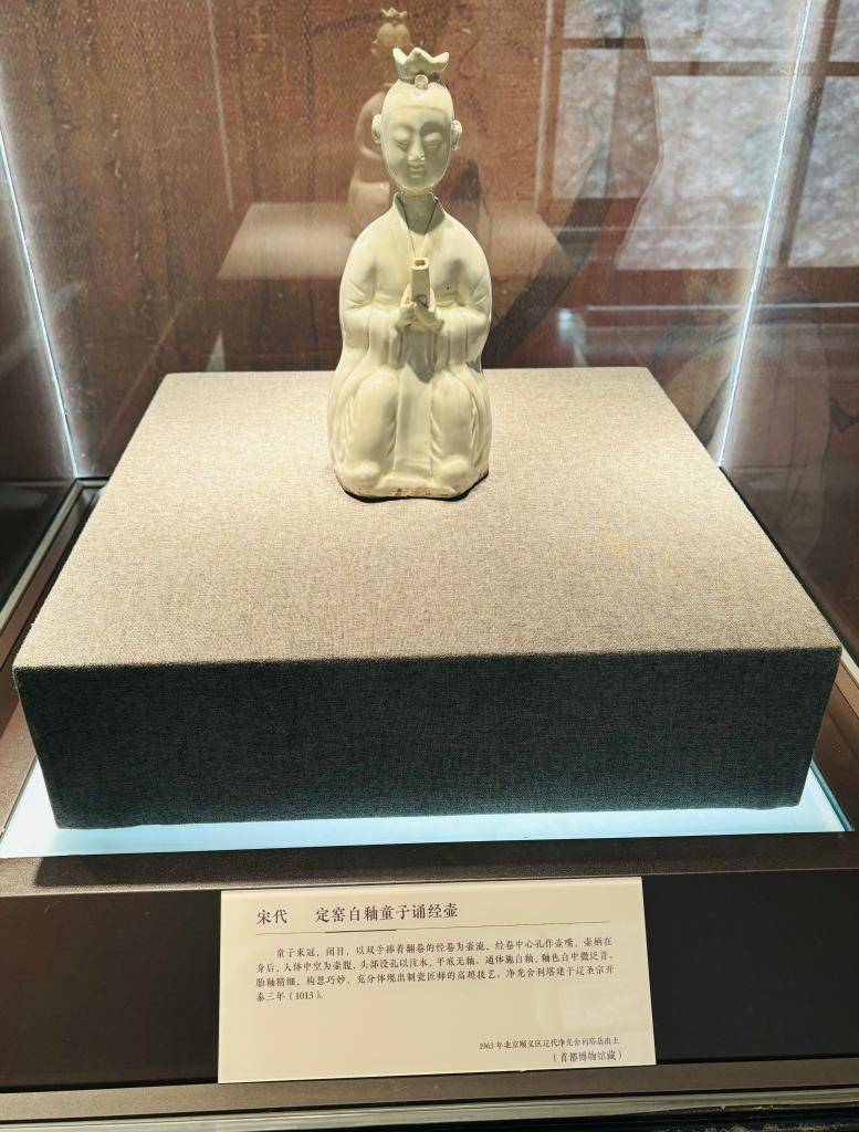 展览中展出的定窑白釉童子诵经壶(宋代)。新华社记者 周润健 摄