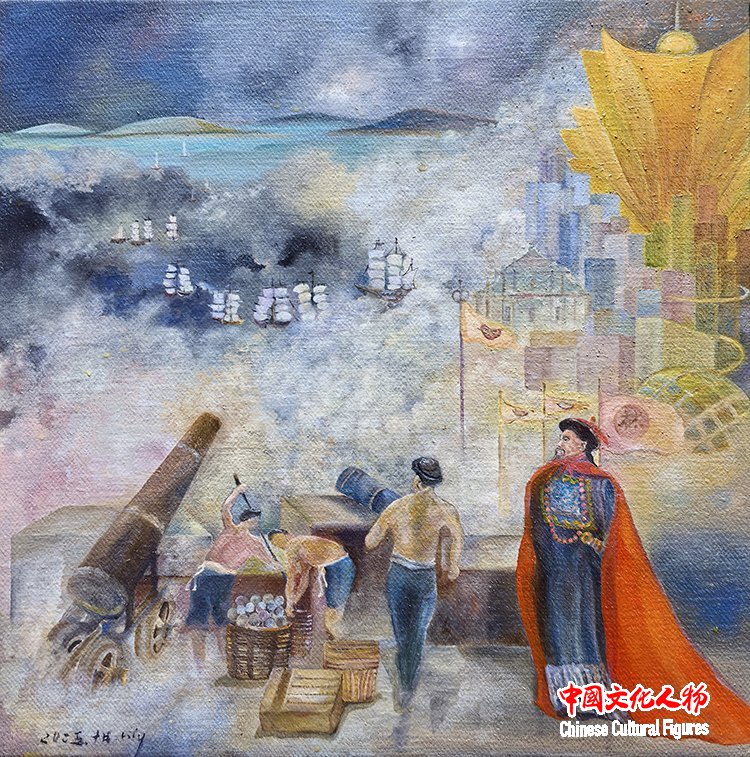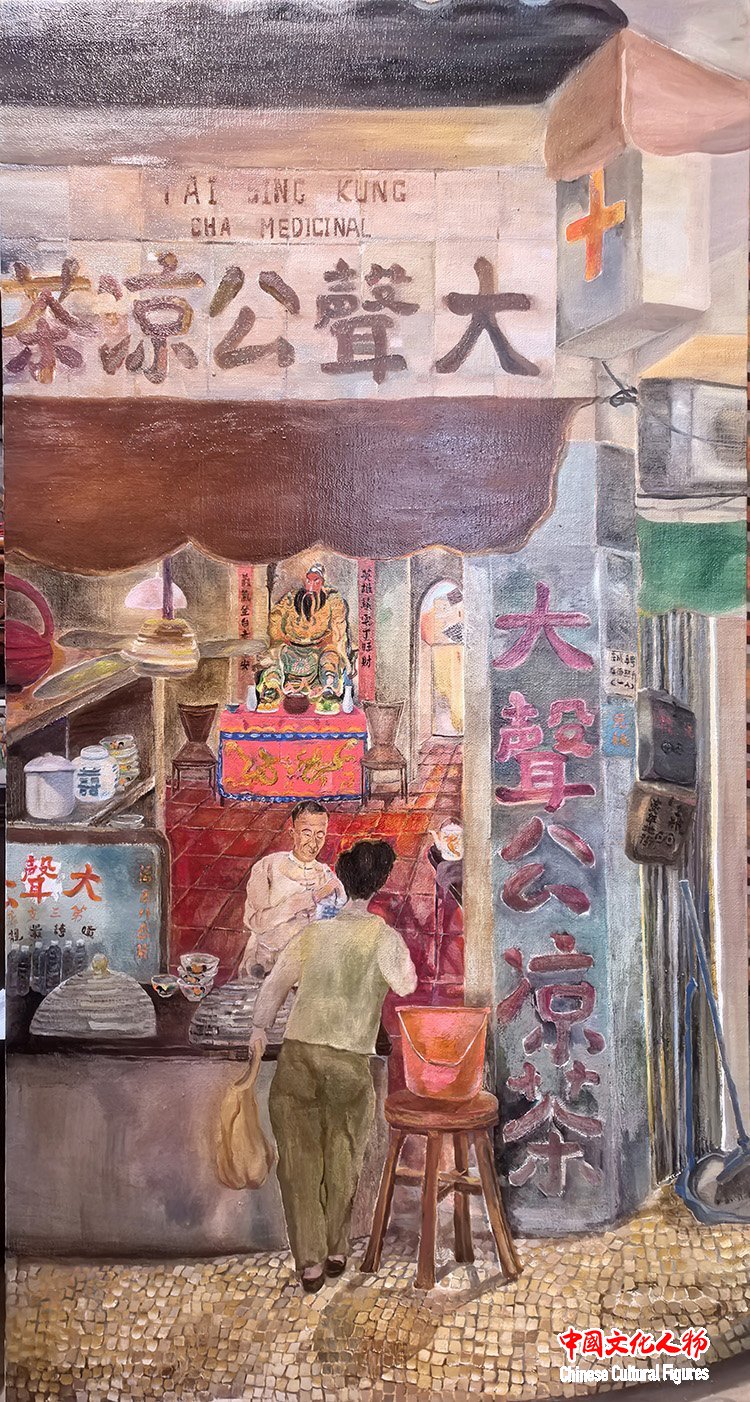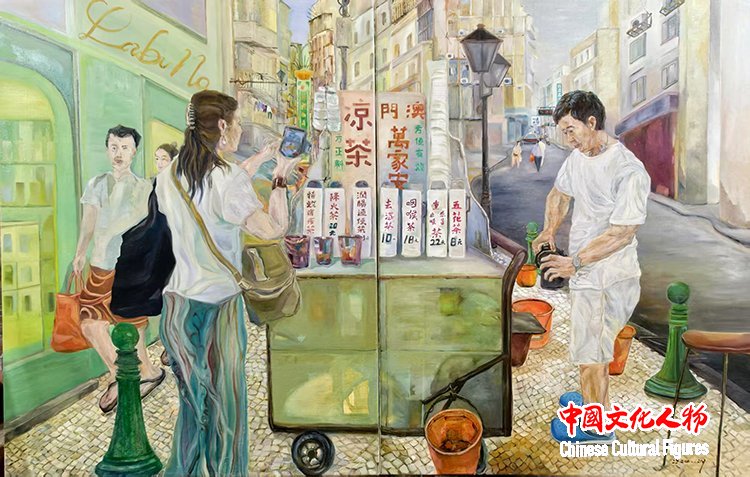 作为一位扎根澳门二十多载的创作者,Lily此次展出的28幅画作,包含油画、丙烯、水彩、墨彩,正是“此”与“彼”的交织产物。“画说澳门凉茶”系列,见生活之道;“澳门烟火”系列,见时间之痕;“古往今来”澳门历史人物系列,是与先贤的对话,借由前辈们的精神火炬,探寻一座城市的历史脉络。