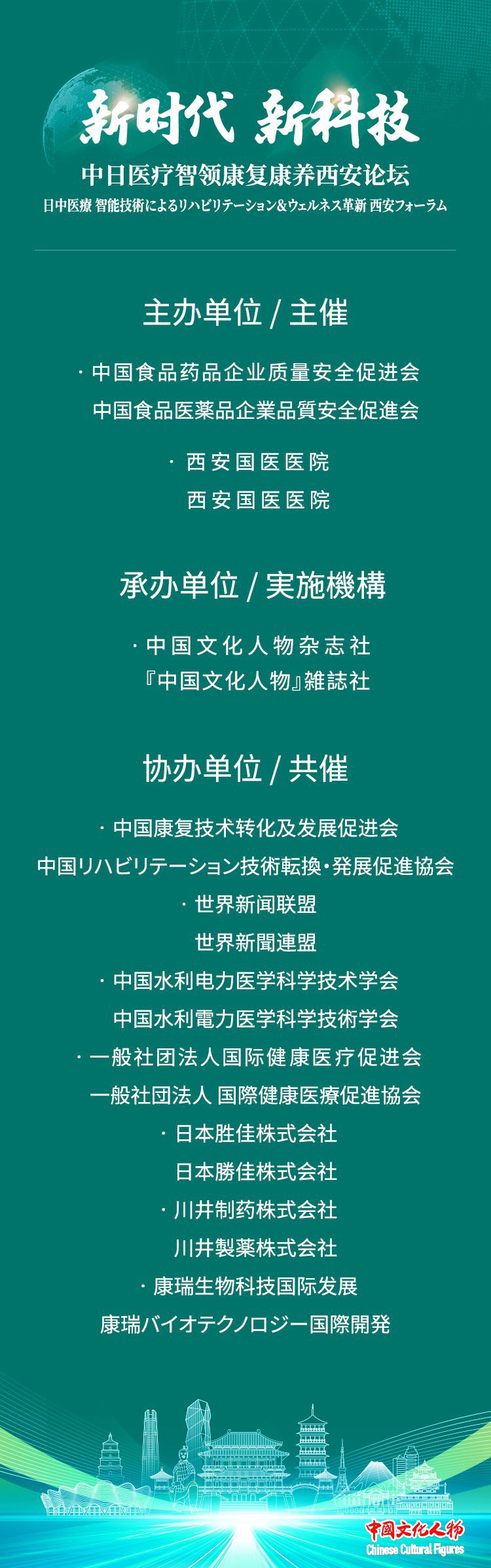 「新時代・新技術:日中医療智能技術によるリハビリテ一ション&ウエルネス革新」西安フォーラムは、中国食品薬品企業品質安全促進会および西安国医医院の主催により開催され、中国文化人物雑誌社が運営を担当。また、中国リハビリ技術転化と発展促進会、世界新聞連盟、中国水利電力医学科学技術学会、一般社団法人国際健康医療促進会、日本勝佳株式会社、川井製薬株式会社、康瑞生物科技国際発展などの団体が協力機関として参加している。